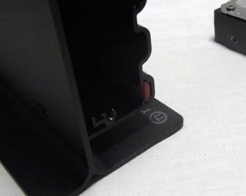 当然縦置き専用なのだが、スタンド部までしっかり金属部品でつくられているので重く安定感がある。またスタンド部は意外とコンパクトに収まっているので樹脂製で左右からはさむタイプのHDDケース縦置きよりむしろ小さく見える。