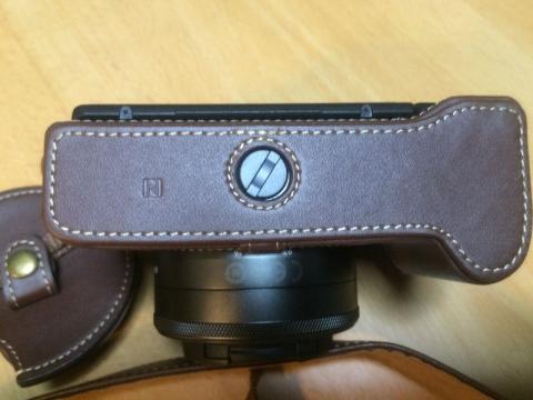 裏面です。ネジはきちんと周囲の皮の中に埋まるようになっていて、飛び出さない辺りは好印象です。SONY NEX-5N用のジャケットは飛び出す代わりに三脚座のネジ穴がきちんと切られているのですが、EH27-CJはきちんと収まる代わりにネジ穴がなく、どちらが便利に感じるかは状況によるとしかいえません。もっとも、マウント変換アダプター EF-EOS Mを介して大きいLレンズを装着すれば、レンズ側の三脚座を使うことは出来ますが…。