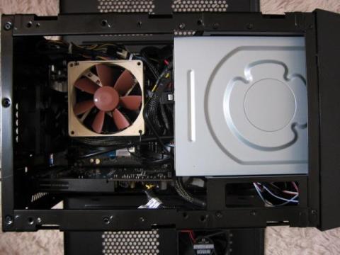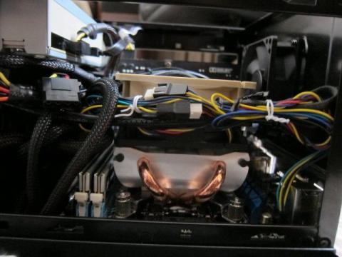 レビュー時は,ハイエンド構成で,エアフロー重視でしたから,CPUクーラーにはH100iを使用しました.H100iを外したので,光学ドライブも設置でき,あわせて,メモリも背高ヒートスプレッダのDDR3-2400から背低のDDR3-1600へダウングレードし,ケーブルに余裕を持たせました.また,CPUクーラー上部に空間が出来たので,天板に120mmファンを設置しました.