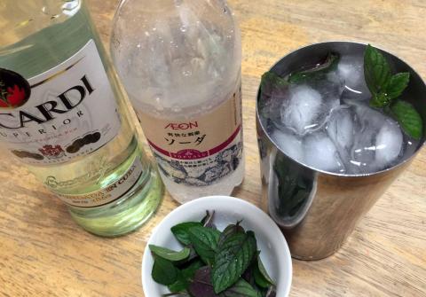 ミントをつぶしながら、砂糖が溶けたらつぶし終了、氷を入れて、ホワイトラムを40cc計量カップで適当に入れる