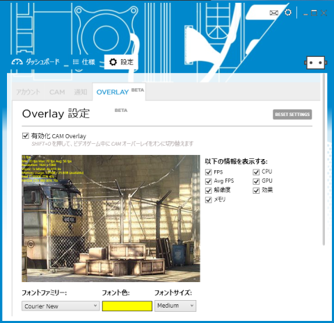 ゲーム画面にモニタリングした情報を表示する機能です。FPS以外にも、CPUやGPUの使用状況が表示されます。フルスクリーンでゲームをしていると、チェックしておきたいPCの状況が確認できなくなりますが、これならプレイしながら確認できます。