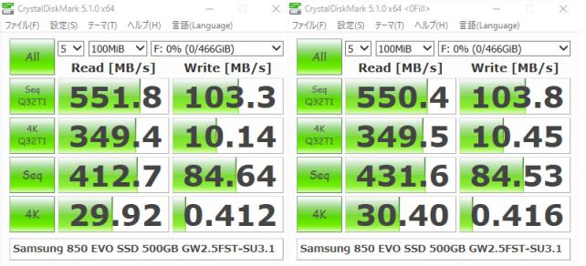 ポータブルSSDとしては立派なスコアなのですが、SATAポートに挿すことで本来の実力が発揮できるSSDのスコアを考えると、ちょっと残念です。
