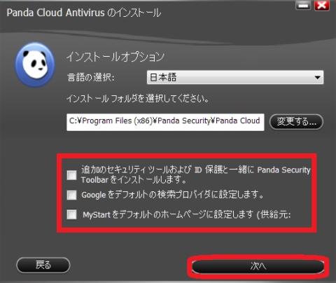 ※ インストール時に Panda Security Toolbar のインストール、Yahoo! の検索プロバイダ設定、MyStart をデフォルトのホームページに設定するよう推奨されます。
