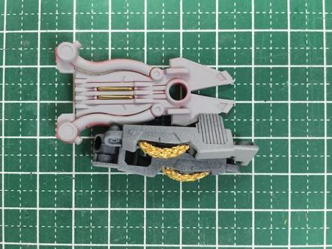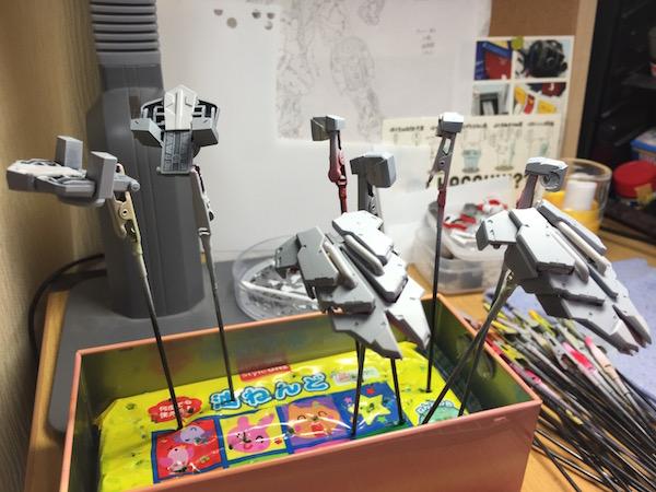 自作パーツはこちらです。ワイヤーを曲げて息子(6歳)の壊れたガンプラからパーツを拝借して…