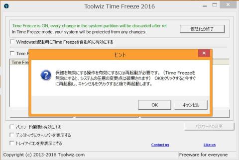 ・例えば、Toolwiz Time Freezeを有効にした状態で、ソフトをインストールしたり、システムに変更を加えたり、ウイルスに感染しても、再起動すれば以前の状態(仮想化前の状態)に戻すことができます。