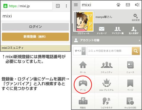 「ヴァンパイア†ブラッド 」はmixiアカウントを取得後、mixiゲームに移動して、検索フォームで「ヴァンパイア」と入れれば簡単にHITします。アプリのインストールをせずにブラウザーを立ち上げるだけで簡単に遊び始めることができるのが手軽に始められます。
