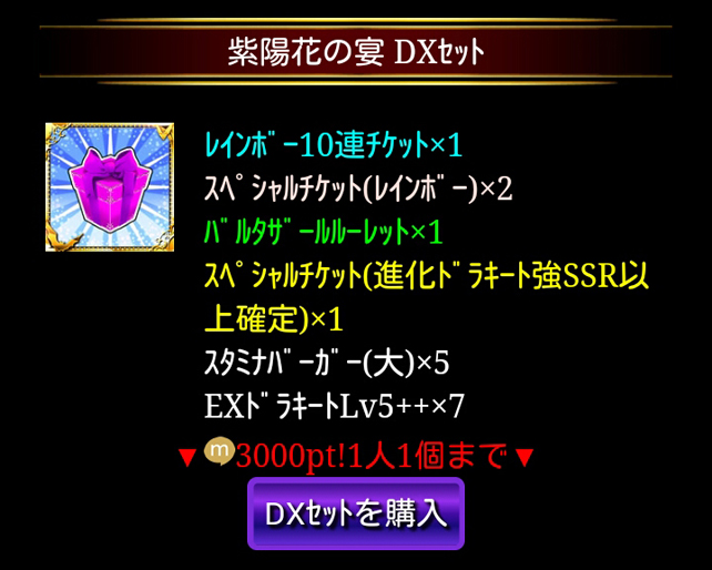 ちょ うどやっていた紫陽花の宴 DXセットが、レインボー10連ガチャ(SR1枚確定)、スペシャルチケット2枚、当時やっていたバルタザールルーレットも楽しめると盛りだくさんで 3,000ptでしたので、一番コストパフォーマンスがよさそうand色々イベント体験できそう?と思ったので、こちらを購入。