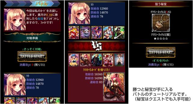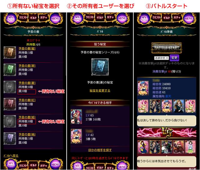 クエストで偶然ゲットするのを待っても良いのですが、非常に時間がかかるので、自分が持っていない(もしくは欲しい)秘宝を持っているユーザーとバトルしてほしい秘宝を奪い取ることが可能です。