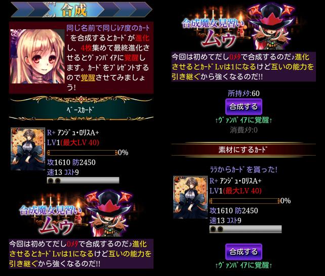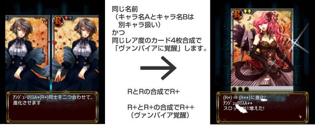 そしてそれぞれのレア度のカードを4枚合成進化でヴァンパイアとして覚醒するようです。もちろんレア度が一番低いNでもちゃんとヴァンパイアとして覚醒します。(上記動画参照)