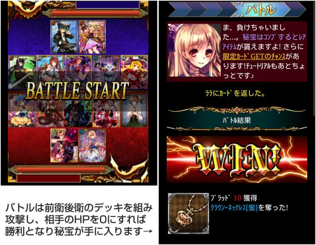 こちらのバトルですが、おもに秘宝入手のために行います。まだ手持ちのカードが少ないので、今回はララちゃんがカードを貸してくれての接待バトルです。