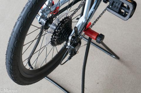 一般的なスタンドがハブ軸を支えるものに対して、こちらはチェーンステーを載せるタイプ。