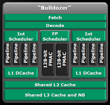 AMDでは、この1ユニットをDualコアとして数えている訳だが、実際にこれをOS上でDualコアとして認識させた場合、Float演算の度合いによっては整数演算コアが片方遊んでる状態になってしまい、OS上での処理速度がガタ落ちすることがあった。