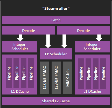 ちなみに、GodavariやKaveriに採用されているユニットは、”Steamroller”という新型ユニットを採用しており、”Bulldozer”ユニットの頃に問題となったフロントエンドでの命令渋滞を解消するため、デコーダが2つに拡張された。
