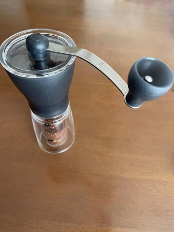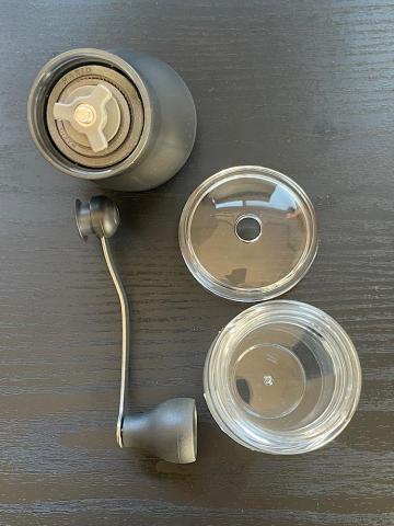 筐体が小さいのでテーブルに置いたまま挽くのは安定しづらいが、小さいので小脇に抱えるようにして挽くには真ん中がくびれていて持ちやすい