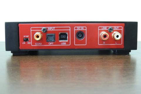 左から、ヘッドホンアンプの出力切替スイッチ、コアキシャル入力、光デジタル入力、USB入力、電源、RCA出力の順。