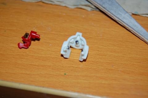 赤いパーツの上部にわっかが残っていますが、接着するのでここも半分切り取ってもよかったかもしれません。