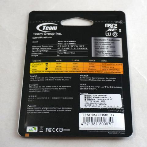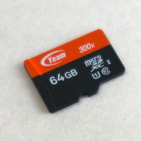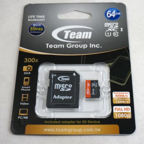 比較的廉価なメモリモジュールやメモリーカードを出しているTeamのClass10対応 microSDXC UHS-I U1対応カード。つくもたんクリアファイルの価格調整も兼ねて32GBあたりのmicroSDを考えていたのだけど、3500円で64GBという容量に釣られて購入。