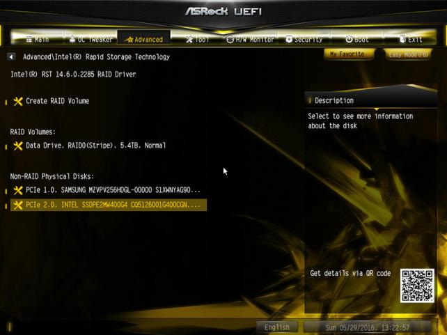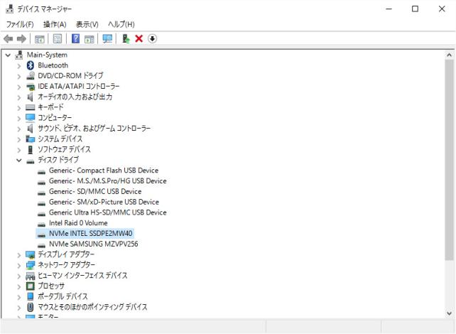 インテル ラピッドストレージテクノロジー画面を見ると、Samsung NVMe M.2 SSDとともに、表示され、システムに認識されていることが確認できます。