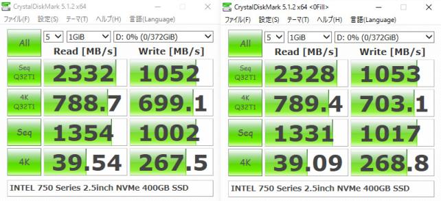 Z170 Expressの帯域に、Samsumg SM951 MVNe 256GB SSDとHGST 3TB HDDx2(RAID-0)が繋がった状態で、4TBx2(RAID-0)のディスクを外して、今回のSSDを割り当てただけなので、本来のパフォーマンスが出ていないのか、Z170 Expressに帯域制限があるのか分かりませんが、アドインカードタイプの750Series SSDより速度が出ていないような気がします。