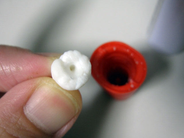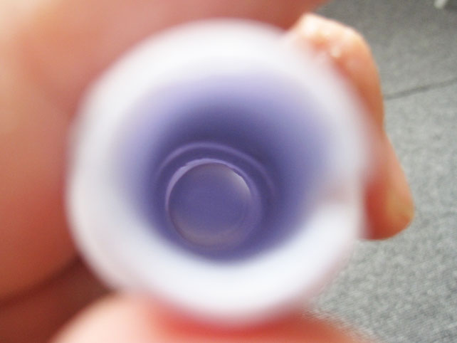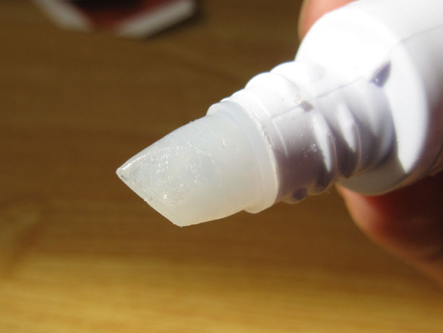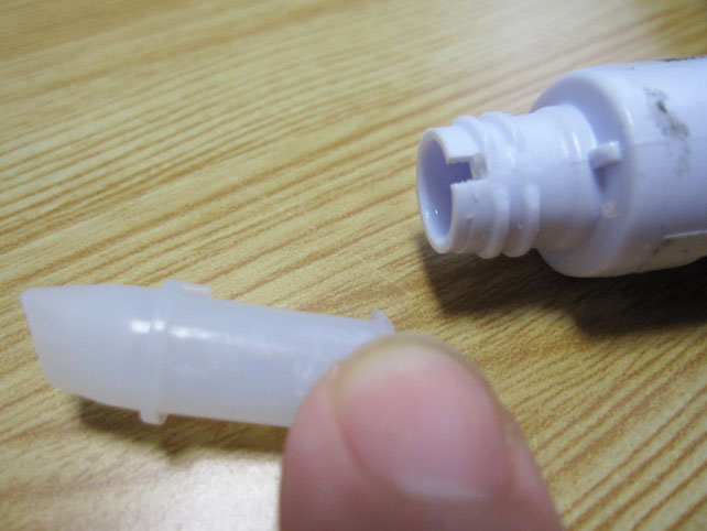 キャップのわきに見えてるのは、キャップ内につまっていた液体のりのカスです。ガンガン使っていたら、木工用ボンドのように、奥に残り、固まったようです。