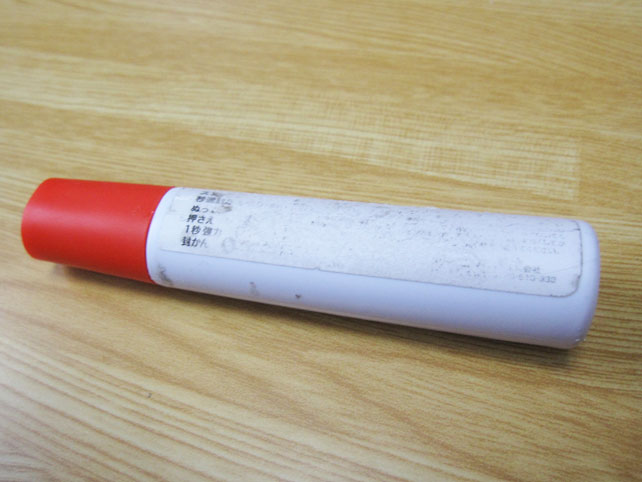 半分くらいに減った後は、本体にかなり力を入れて押さないと、液体のりがちゃんと出なくなってきました…。減った後は、これが安定の持ち方