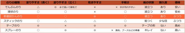 ■液状のり:なめらかで塗りやすいけれども、水分が多く、紙が波打つ