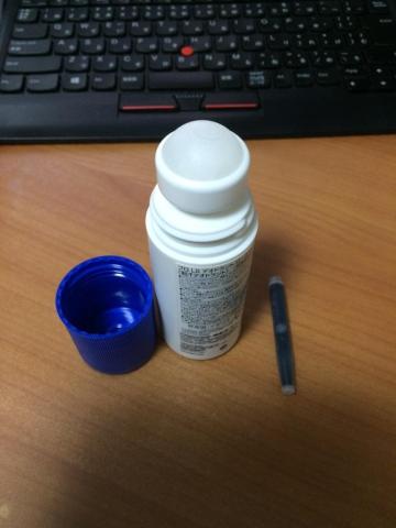 ロールオンタイプなので、本体は巨大なボールペンと同じ構造になっている。ボールが転がると液体が付着して、対象物に塗布できる構造です。