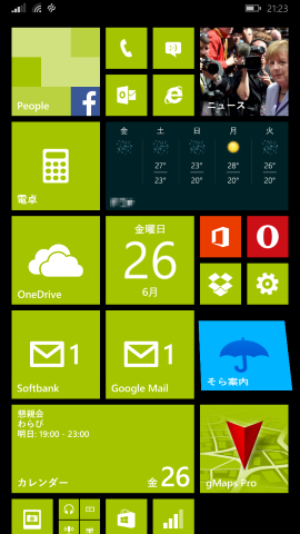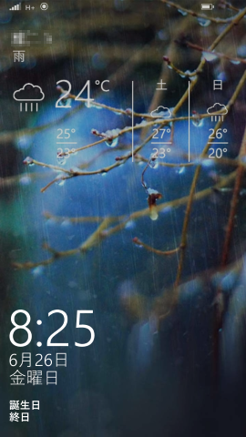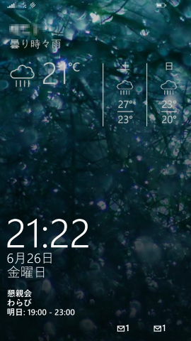 ロック画面は天気予報をメインに、予定やメール表示も出ます。