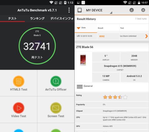 CPUはSnapdragon 615のオクタコアですが、ベンチマークテスト中はSnapdragon 810のような発熱はなくほんのり熱い程度。
