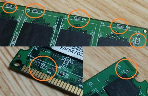 16.PC4200-1GBの方は1か所のクラックなので、そのまま動作するかも知れませんが、これくらいなら修理も簡単です。ただ、15.PC5300-1GBの方は9か所もクラックしているので、修理しないと動かないと思います。まあ、セラコンは安いしパスコン用途ならあまり容量を選ばないので0.1uF程度のものを付ければ大抵動作します。電子工作キットと思えば良いでしょう(^^;