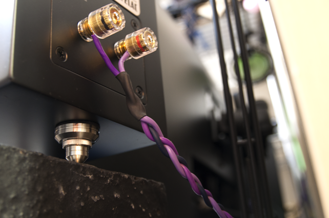 スピーカーの下に高さ調節が可能なステンレスのインシュレーターを3点保持で設置、手前を+8mmほど持ち上げて角度を付けています。