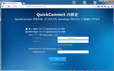 QuickConnect IDは上に写っている通りsayumiですのでそれを入力し、アカウント情報を入力します。