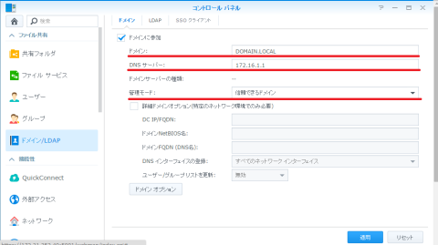 3.ドメインにWindows環境で利用しているドメイン名、DNSサーバにドメイン環境で利用しているDNSを、管理モードに「信頼できるドメイン」を設定し、適応を推します。