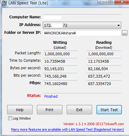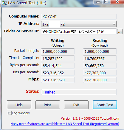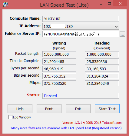 今回は速度を測定するソフトとして、LAN Speed Test (無料版)を利用します。測定相手の共有フォルダを設定するだけでスピードテストを行うことが出来ます。