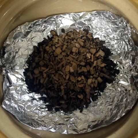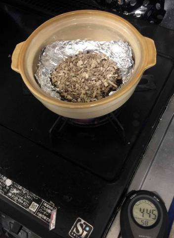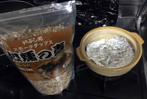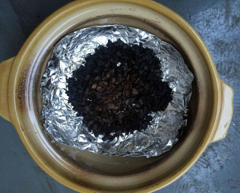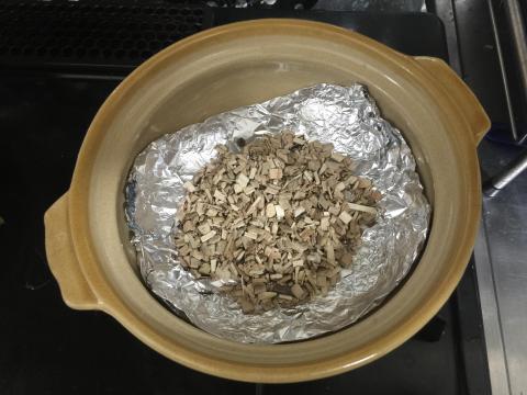 鍋の底にアルミホイルを敷き、燻製チップを一握り敷きます