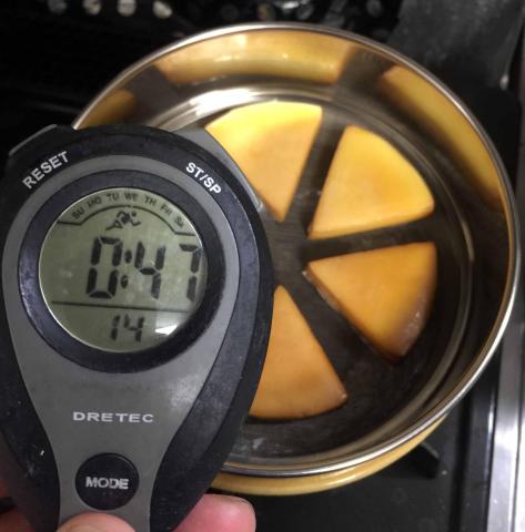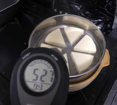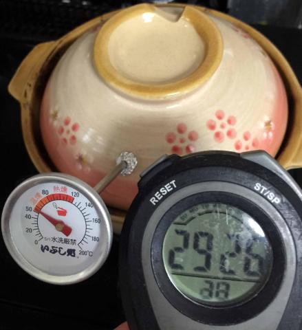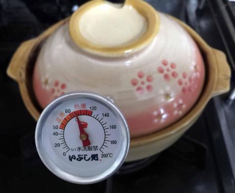 ガスコンロの中火で90度まで上がります、細火に落とすと80度~90度で落ち着くようです