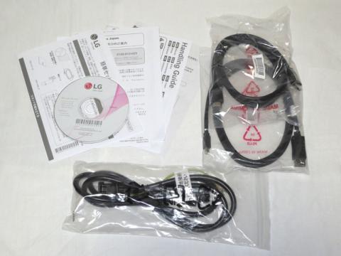付属品は簡易セットアップマニュアルや注意書きの紙類数枚、ドライバディスク、HDMIケーブル、ディスプレイポート(標準>ミニ)ケーブル、ACケーブル。
