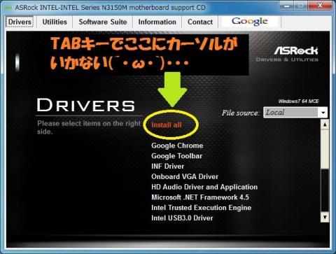OSのインストールはキーボードだけで問題ないのですが、ドライバDVDのインストールアプリがTABキーだと、開始する部分にカーソルが行かないんですね・・・