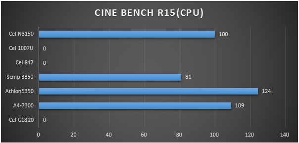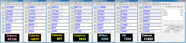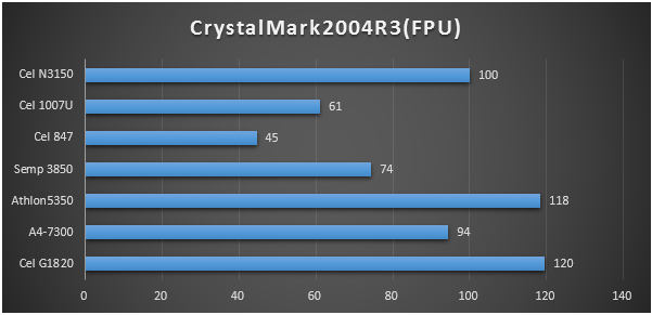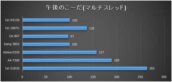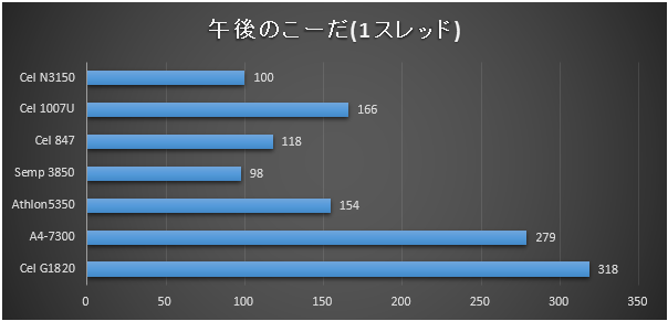 午後のこーだーのベンチを見ると、Celeron N3150のシングルスレッドの性能は概ねCeleron847やSempron3850程度の性能だと言うことがわかります。その為、マルチスレッドのベンチだと2コアのCeleron847よりもスコアが高くなり、4コアのSempron3850を少し上回る程度の性能となります。