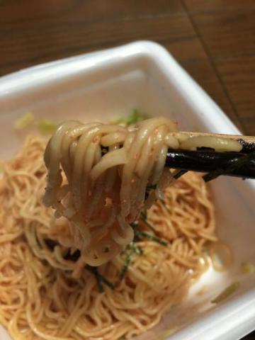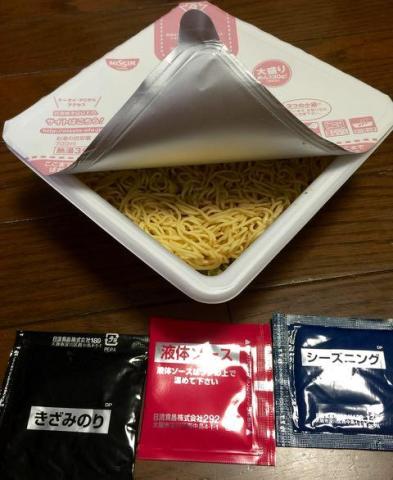 たらこ焼きそばとしては標準的な組み合わせ。シーズニングに液体ソース、刻み海苔は黒。