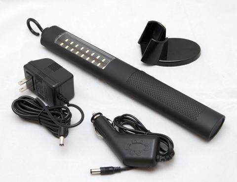 本品は充電式ですが、やはり車関係での利用が多いのか ACアダプターの他にシガーソケット(12V・24V兼用)用充電器が付いています。奥側にあるのはスタンドです。