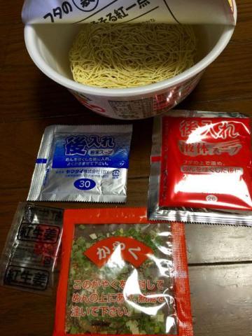 極細麺と後入れスープ2種、かやく、紅生姜です。結構リッチ