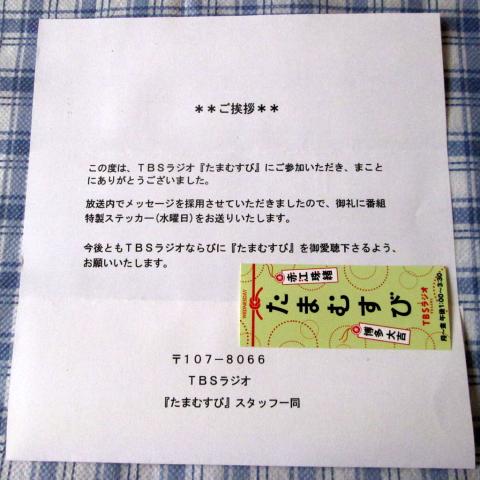 FM補完放送の公知を目的として、夏ごろからは封筒も新しくなり、たまむすびステッカーと一緒に新しい TBSラジオのステッカーが 2枚同封されるようになっています。