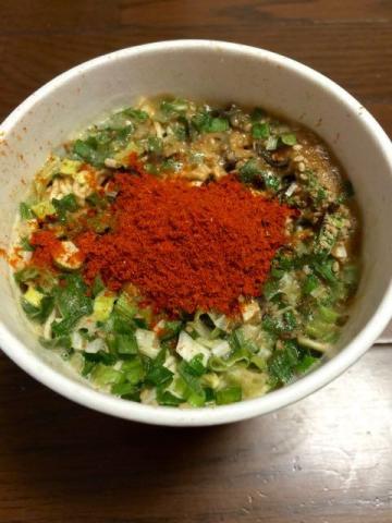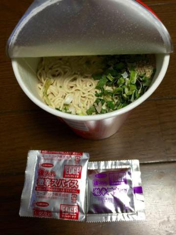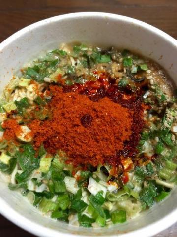 まさかのダブル後入れ激辛スパイス。豚骨スープはカップイン