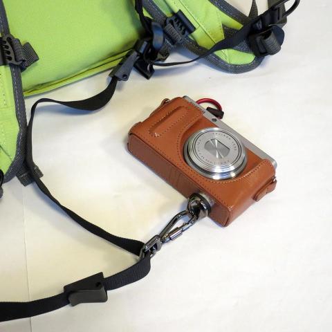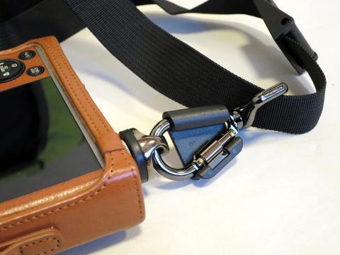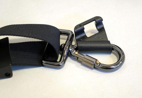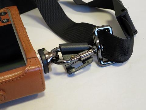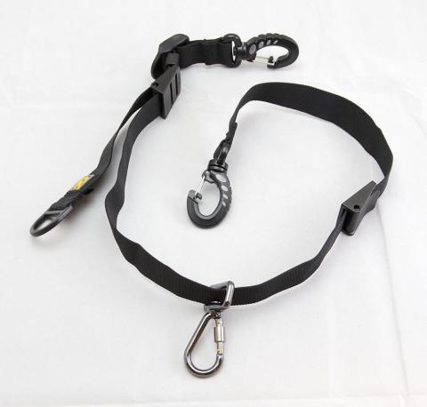最近の R-ストラップにはカラビナがよく付いているのですが、何に使うのかと思っていたら、腰のベルトループにカラビナを留め、移動時などにカメラやベルトを引っかけておく事で動かないようにするための様です。