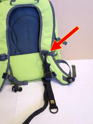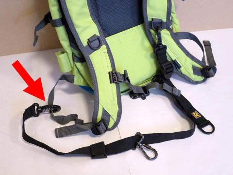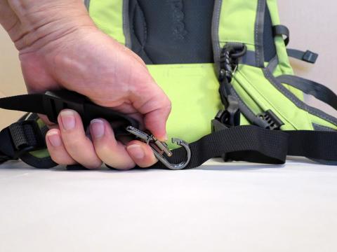 まずパックパックに装着するには、背負う前に Dリング側をひっかけておいた方が楽です。