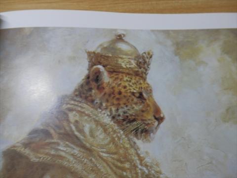 上記画像のグインの毛皮のもふもふ感と、宝冠の煌きと質感、その両方が同じ画材の一見無造作にも見えるタッチで表現されています。