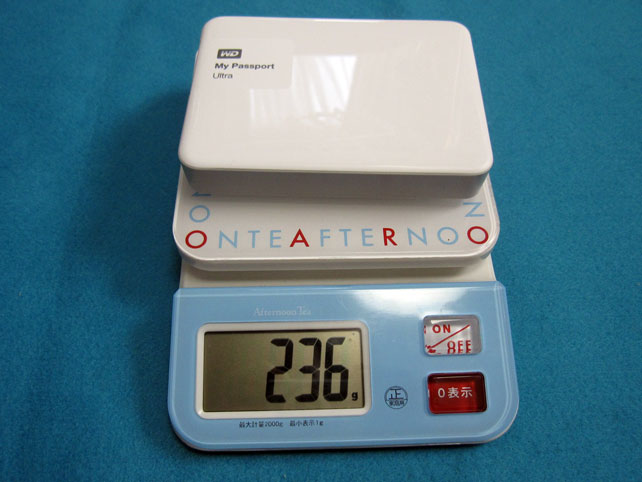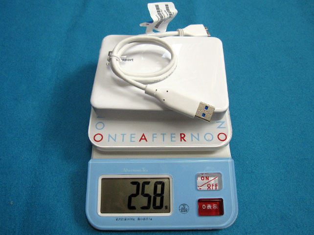 コードを含めると258gです。私の持っているタブレットPCよりは軽いです。ただ、これを単体で持つとずっしり来る気がします…。本体だけで200gは切って欲しいなぁ。でも2TBですし、まあこれくらいなら、持ち歩けなくはないです。許容範囲ですね。