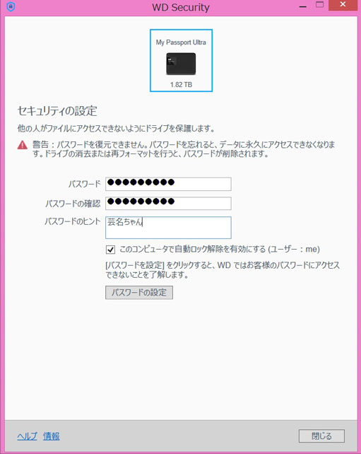 USBポートに挿すと、Fドライブに「WD Unlocker」が現れ、パスワードを求められます。