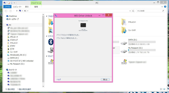 先ほど設定したパスを入力すると、ロックが解除され、Gドライブに「My Passport」が出、アクセスが可能になりました!WD SecurityをインストールしていないPCでも、ちゃんと解除でき、ドライブ内に保存したデータが利用できます。